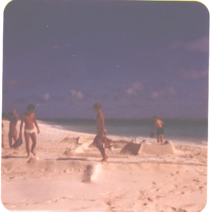 Building a sandcastle on NavFac Beach; Oct 76